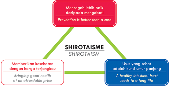 Kesehatan selalu menjadi sesuatu yang berharga bagi kita semua. Dr. Minoru Shirota, Pendiri Yakult, percaya akan pentingnya pencegahan sebelum sakit dan “usus yang sehat membawa pada umur panjang”. Beliau menganjurkan untuk menyebarkan kesehatan yang diinginkan setiap orang dengan harga terjangkau. Ide-ide Dr. Shirota ini disebut sebagai “Shirotaisme” dan menjadi dasar bagi kegiatan usaha Yakult.